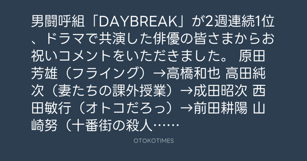 男闘呼組「DAYBREAK」が2週連続1位、ドラマで共演した俳優の皆さまからお祝いコメ...