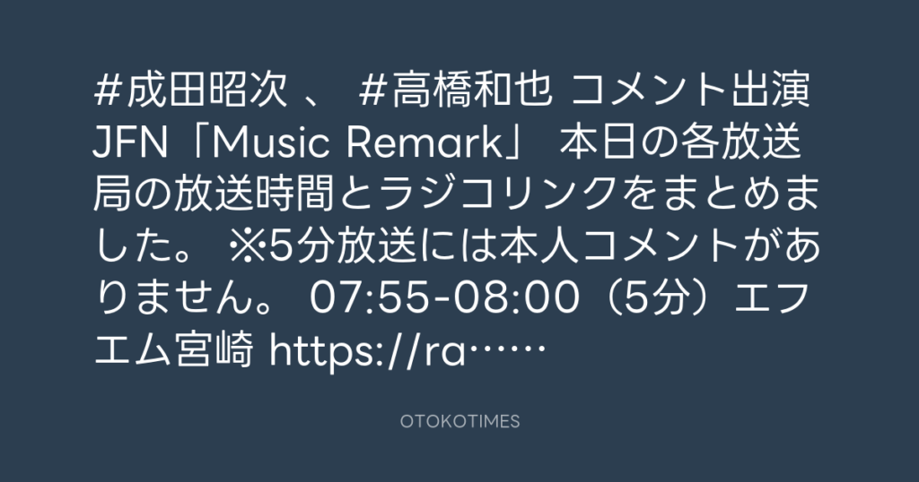 📻 #成田昭次 、 #高橋和也 コメント出演 JFN「Music Remark」 本日の各放送局の... -