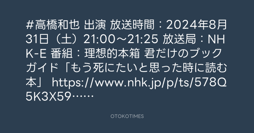 #高橋和也 出演 放送時間:2024年8月31日(土)21:00〜21:25 放送局:NHK-E 番組:... -