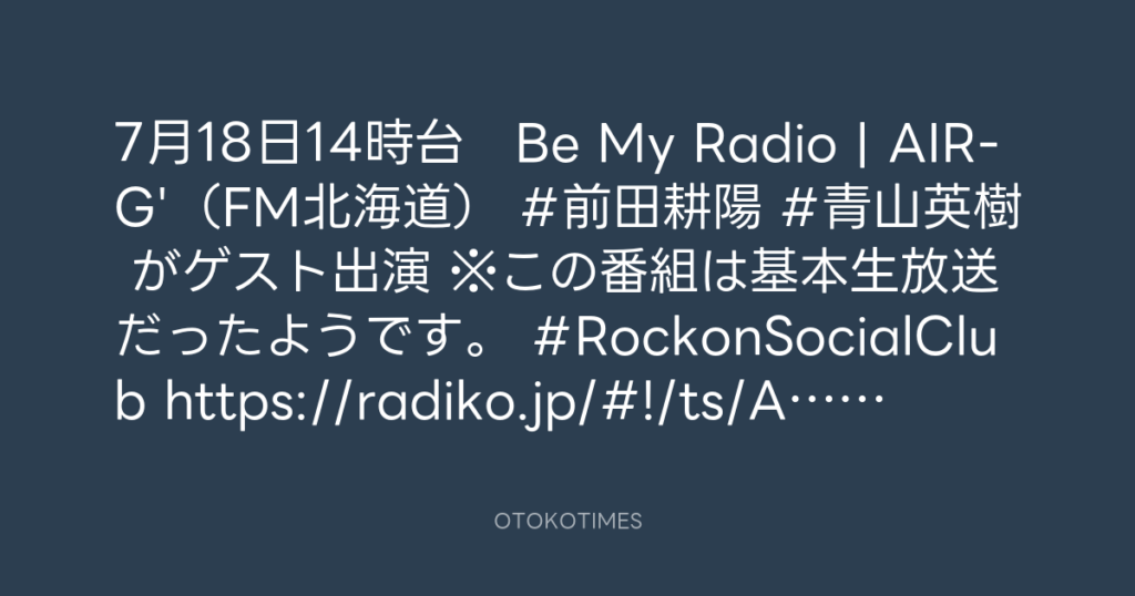 RT @rockonsocialclu: 📢ラジオ番組出演情報📻 ✅7/18(木)12:00~ AIR-G’ FM北海道... -