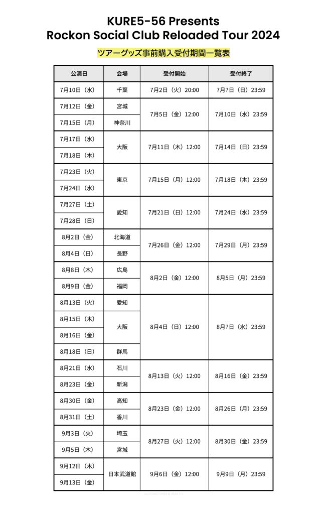 #ReloadedTour2024 ツアーグッズ事前購入受付期間一覧表 公演毎に受付期間が異なり... -