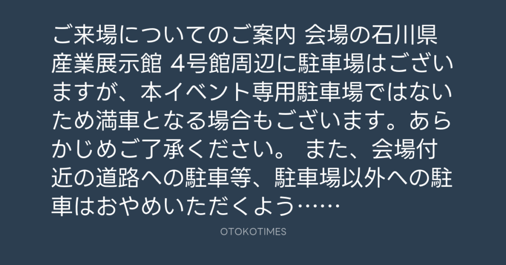 📢ご来場についてのご案内 会場の石川県産業展示館 4号館周辺に駐車場はございます... -