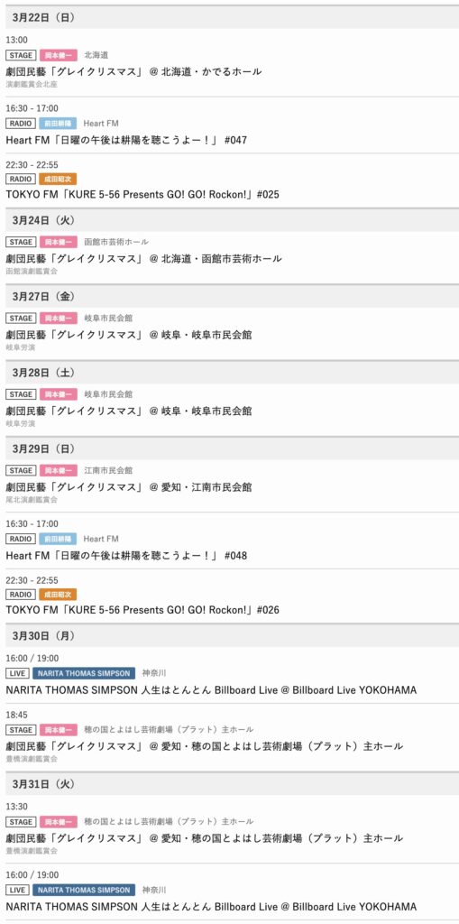3/22〜3/31までのスケジュールをお届けします。 ※現時点で確認可能な範囲のみ。 (... -